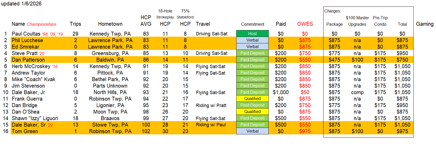 The HCP AVERAGES that are listed are based on your 3 BEST scores in Myrtle Beach over the past 5 years AND your overall Myrtle Beach Average. Please click "All Time Trip Scores" to see all of the scores and how the averages are tabulated. Players with less than 10 rounds played will have 1 DUMMY score that reflects their potential added. Rookies will have a HCP AVERAGE assigned to them that reflects their potential, not their average.