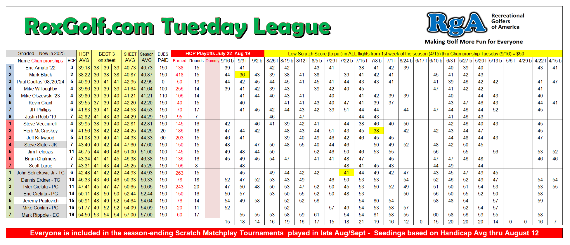 The HCP AVERAGES that are listed are based on 4 values. It is your 3 BEST scores on the sheet over the past 21 weeks AND your overall Sheet Average. Players with less than 10 rounds played will have their average based on their BEST 3 scores, 1 DUMMY score, and their overall average. Once you record 10 scores, your DUMMY score will disappear.